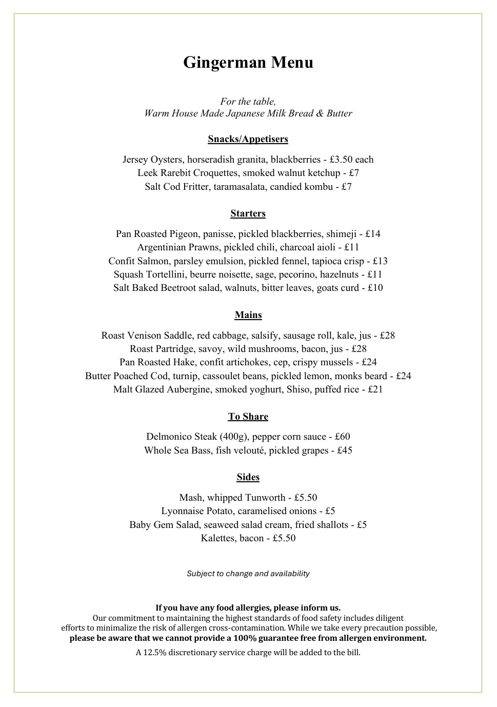 OUR MENU OUR MENU CHEFS SELECTIONCHEFS VEGETARIAN SELECTIONA LA CARTE DESSERTSSET LUNCH MENUSUNDAY LUNCHSUNDAY DESSERTSCHRISTMAS MENUWINE & DRINKS Click here to see a larger version of the current Menu Click here to see a larger version of the current Menu Click here to see a larger version of the current Menu Click here to see a larger version of the current Menu Gingerman wine & drinks list KEEP IN TOUCH WITH THE LATEST GINGER NEWS & EVENTS First Name Last Name Email Address Please email me with great offers and information about what's going on at our venues *
